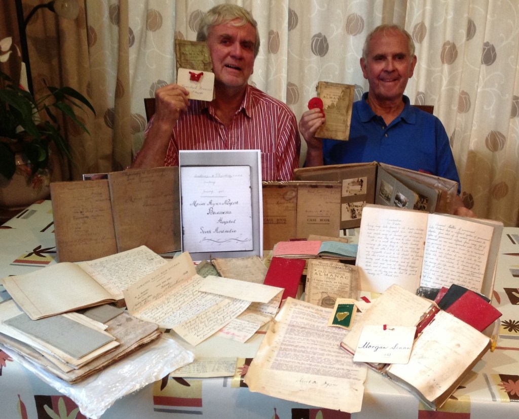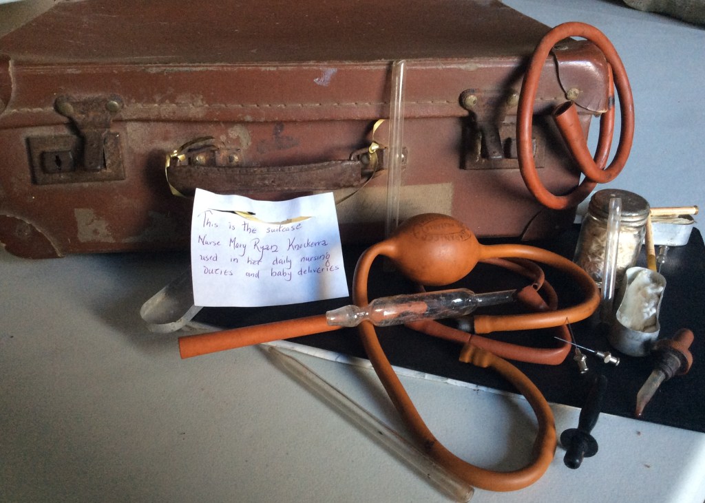 Above is a photo of her sons Benedict and Michael Ryan (Knockerra and England) presenting their mother’s memorabilia to the Local History Group. This included her medical suitcase with her medical devices, her college notes from her time in Australia, her photos from her time in Australia and her diaries relating to her time as a midwife.