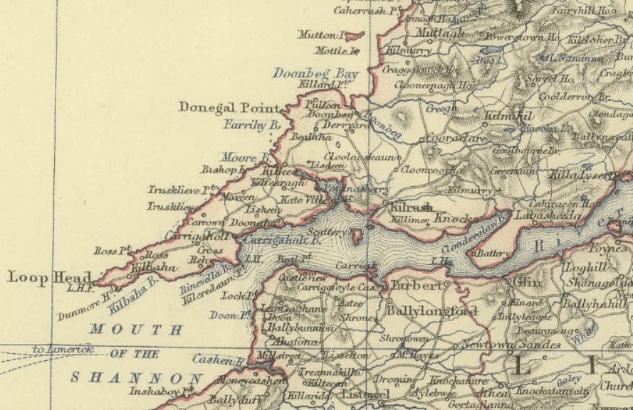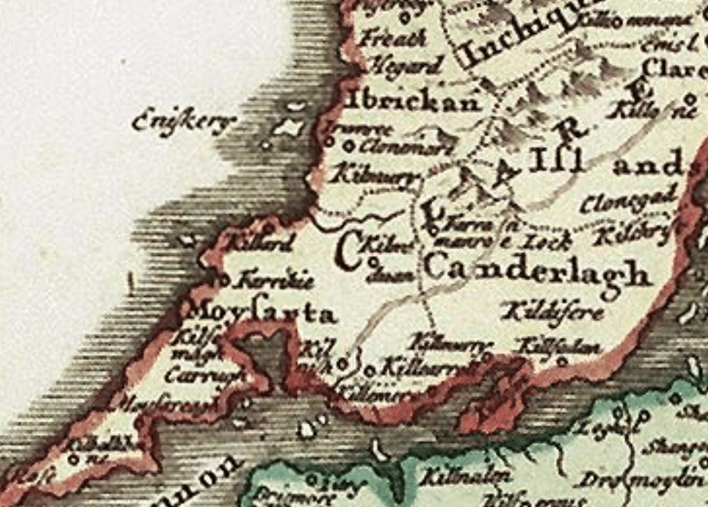 This map, while a bit blurrier than the others, shows clearly the divide between the Baronies of Moyarta and Clonderlaw.