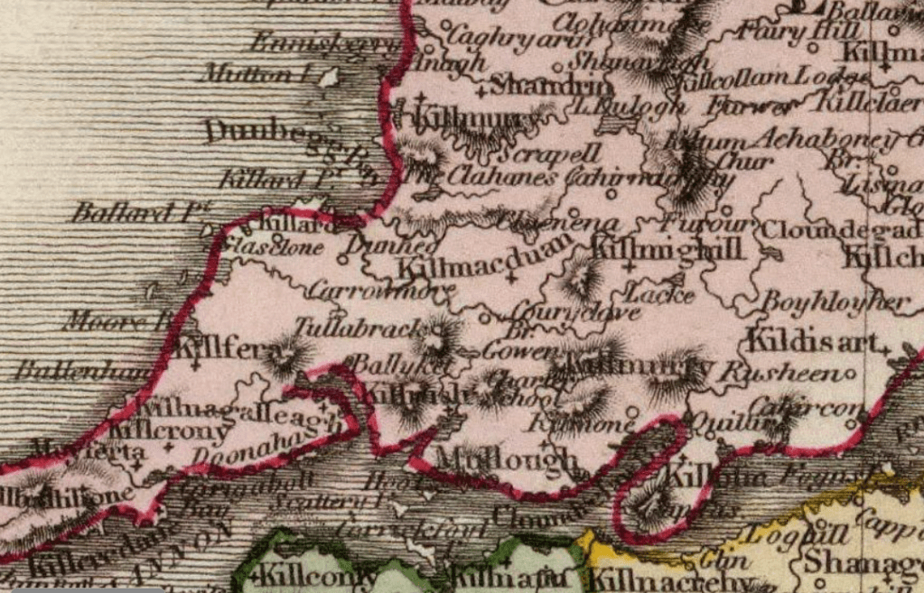 Like all place-names, the spelling of Killimer, and its townlands, has evolved over many years due to them being recorded in an anglicised fashion and also through different translations and interpretations of the Irish language. This is visible in the following maps through the ages.