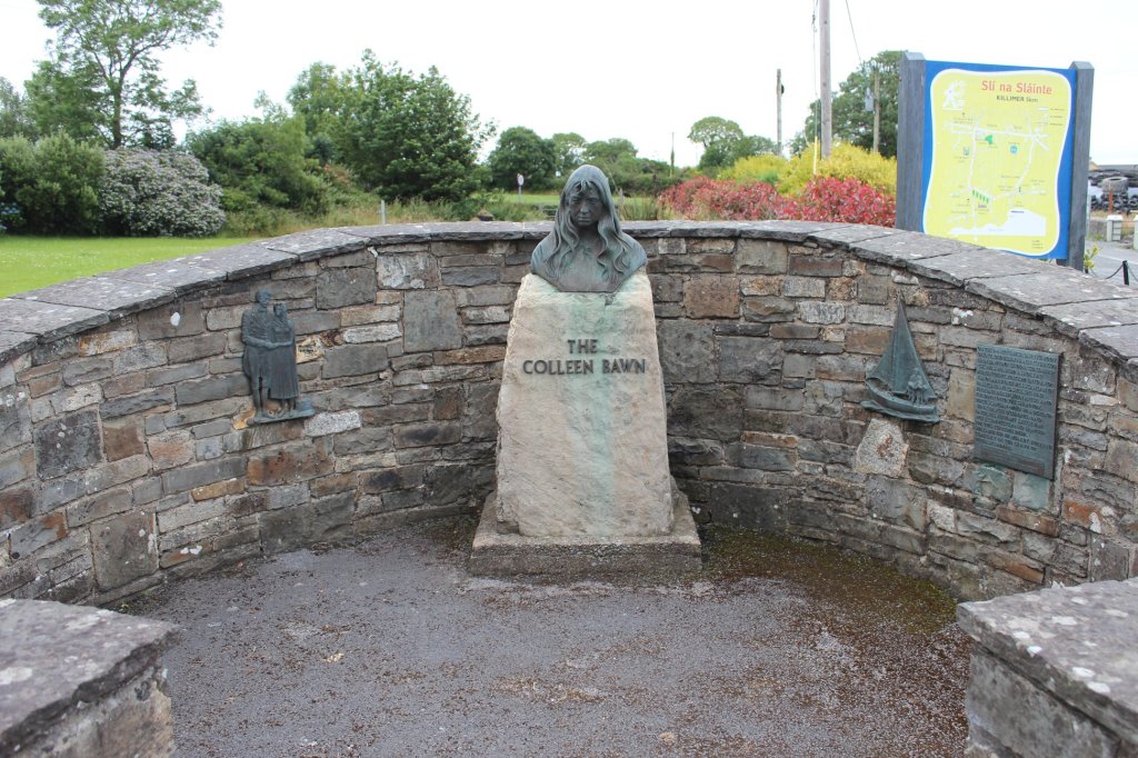 This has been chipped away by souvenir hunters and has been replaced by a flagstone which also suffered the same fate. In more recent times a bronze plaque has been attached to a stone slab to commemorate the Colleen Bawn. Her grave is situated in the old Burrane graveyard inside the stile. A bronze statue, depicting her, was erected in her memory beside the Colleen Bawn shop.