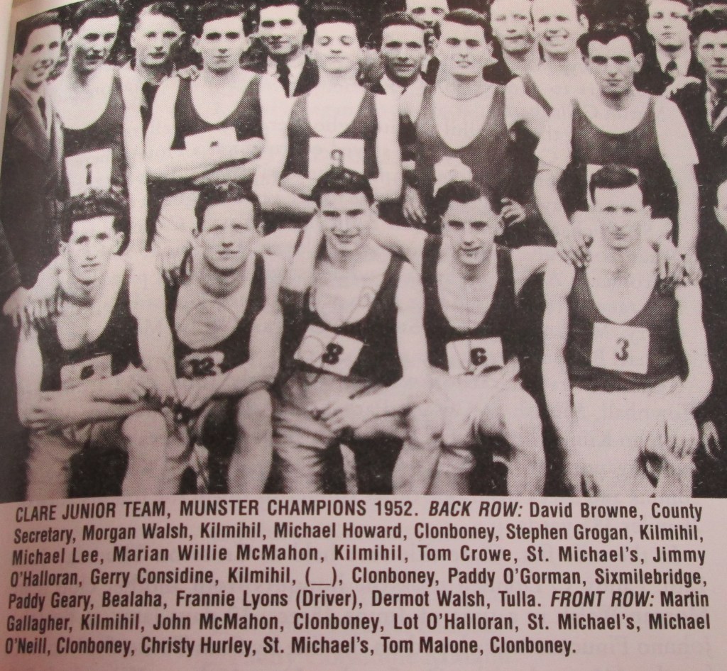 Records are scant up to about 1938. In that year many from the parish competed with Kilrush N.A.C.A. to win the All- Ireland Junior Championship in Belfast. John Hassett from Burrane was first home; the other scoring members were Dan Cunningham (Donail), Joe McInerney (Donogrogue Castle), Jim Galvin (Tarmon), Jimo Fitzpatrick (Knockerra) and Timmy Ryan (Knockalough). John Hassett went on to win the All- Ireland Senior Individual title that same year.